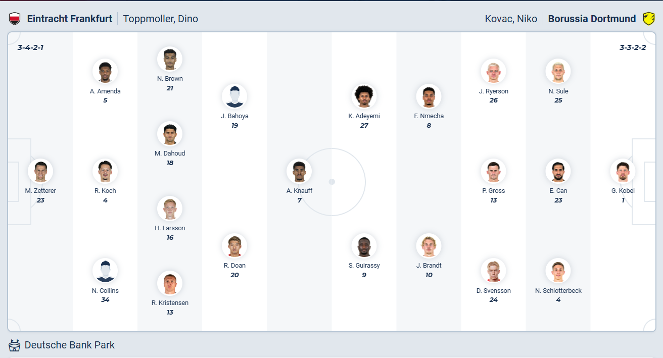 Frankfurt đang đứng thứ 7 trên bảng xếp hạng Bundesliga, so với vị trí thứ 3 mùa trước thì rõ ràng đội bóng của HLV Dino Toppmöller đang chơi không tốt bằng. Phong độ không ổn định thời gian gần đây cho thấy điều đó khi các cầu thủ Frankfurt chỉ thắng 2/5 vòng đấu gần nhất. Rõ ràng Frankfurt cần chơi tốt hơn thì mới có thể cải thiện thứ hạng của mình nhưng vòng 16 họ phải đối đầu với một Dortmund được đánh giá cao hơn nên mọi thứ rất khó khăn, nhiều khả năng sự cố gắng của đội chủ nhà chỉ có thể giúp họ có được kết quả hòa.
