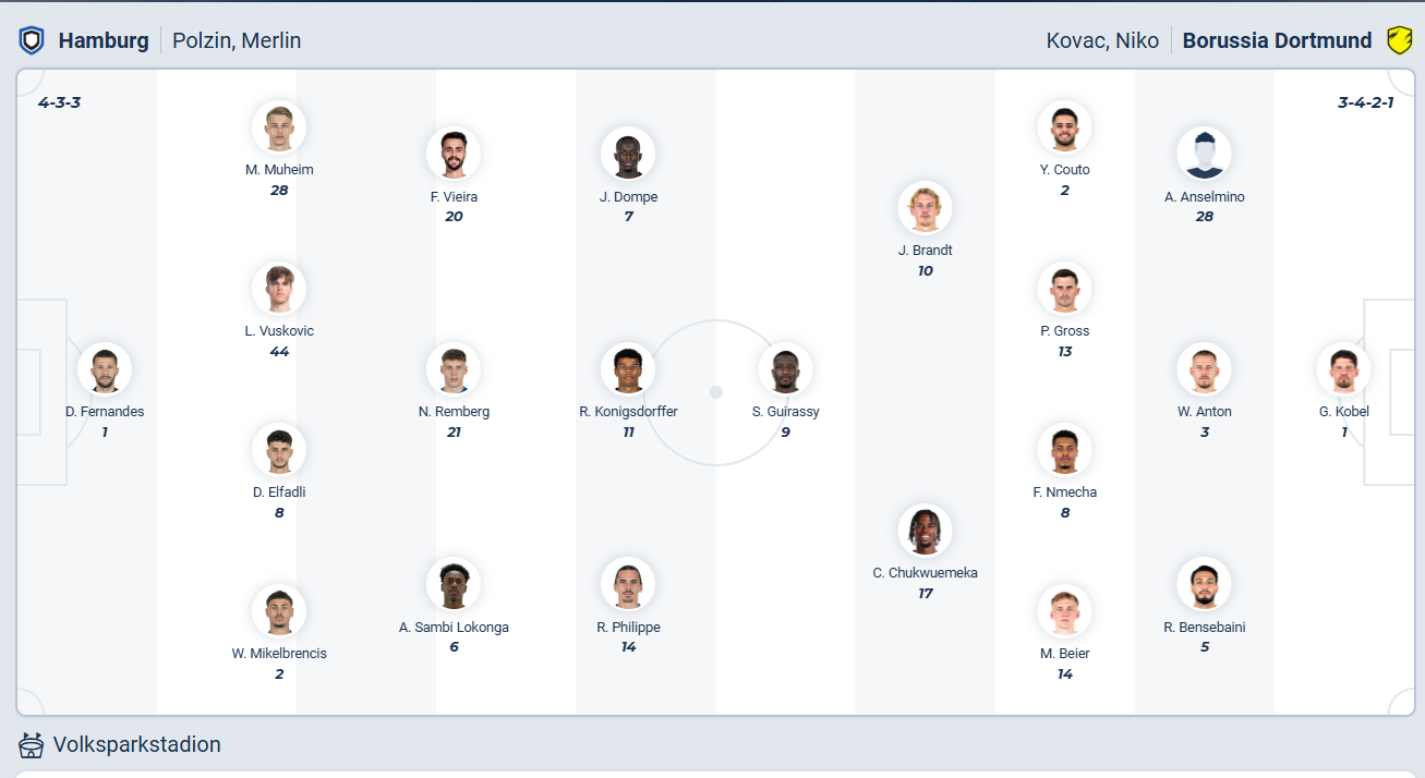 Hamburg đang đứng thứ 13 trên bảng xếp hạng, chỉ hơn đội cuối bảng 3 điểm. Đây là vị trí không hề an toàn và các cầu thủ của HLV Merlin Polzin cần chơi tốt để tạo ra khoảng cách lớn hơn với nhóm xuống hạng thì mới có thể trụ hạng vào cuối mùa. Họ cần chấm dứt chuỗi 3 trận thua liên tiếp của mình. Tuy nhiên ở vòng đấu thứ 10 này đối thủ của Hamburg là một Dortmund có chất lượng đội hình tốt hơn rất nhiều nên xem ra cơ hội có điểm là không cao, nhiều khả năng chuỗi trận thua liên tiếp của Hamburg sẽ kéo dài lên con số 4.