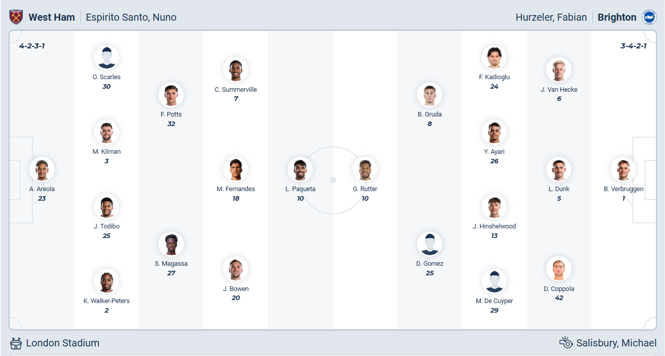 Brighton cũng đang chơi không tốt như West Ham, họ không thắng 5 vòng đấu gần nhất trong đó có tới 3 trận thua. Nhưng đội bóng của HLV Fabian Hürzeler vẫn có vị trí thứ 12 chứ không thảm hại như West Ham, dù vậy họ cũng cần một kết quả tích cực để leo lên nửa trên bảng xếp hạng. Chính vì vậy Brighton đặt mục tiêu giành chiến thắng khi đến làm khách trên sân của West Ham. Trong bối cảnh cả 2 đội đều cần chiến thắng nhưng lại không có phong độ tốt thì nhiều khả năng trận đấu sẽ kết thúc với tỉ số hòa.